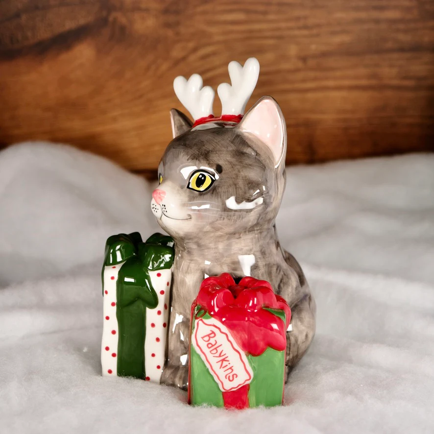 Hand-painted with meticulous detail, this festive feline wears a red antler headband and sits proudly between two beautifully wrapped presents — one adorned with a polka-dot bow and the other labeled “Babykins.” With its bright eyes, soft gray fur, and glossy finish, this charming ceramic piece captures the whimsy and warmth of the season.