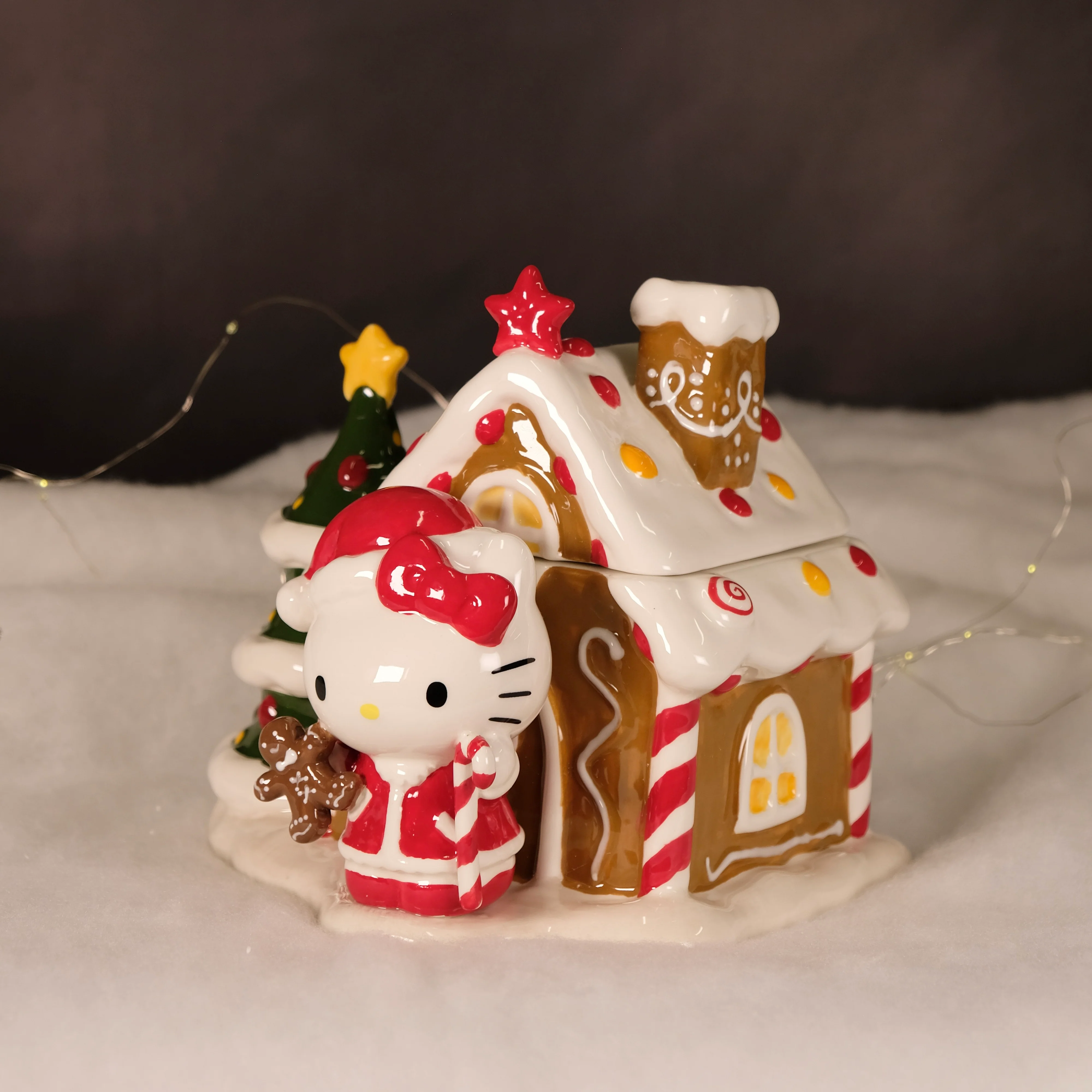Sweeten up your holiday dΓ©cor with this festive Hello Kitty Gingerbread House Cookie Jar!