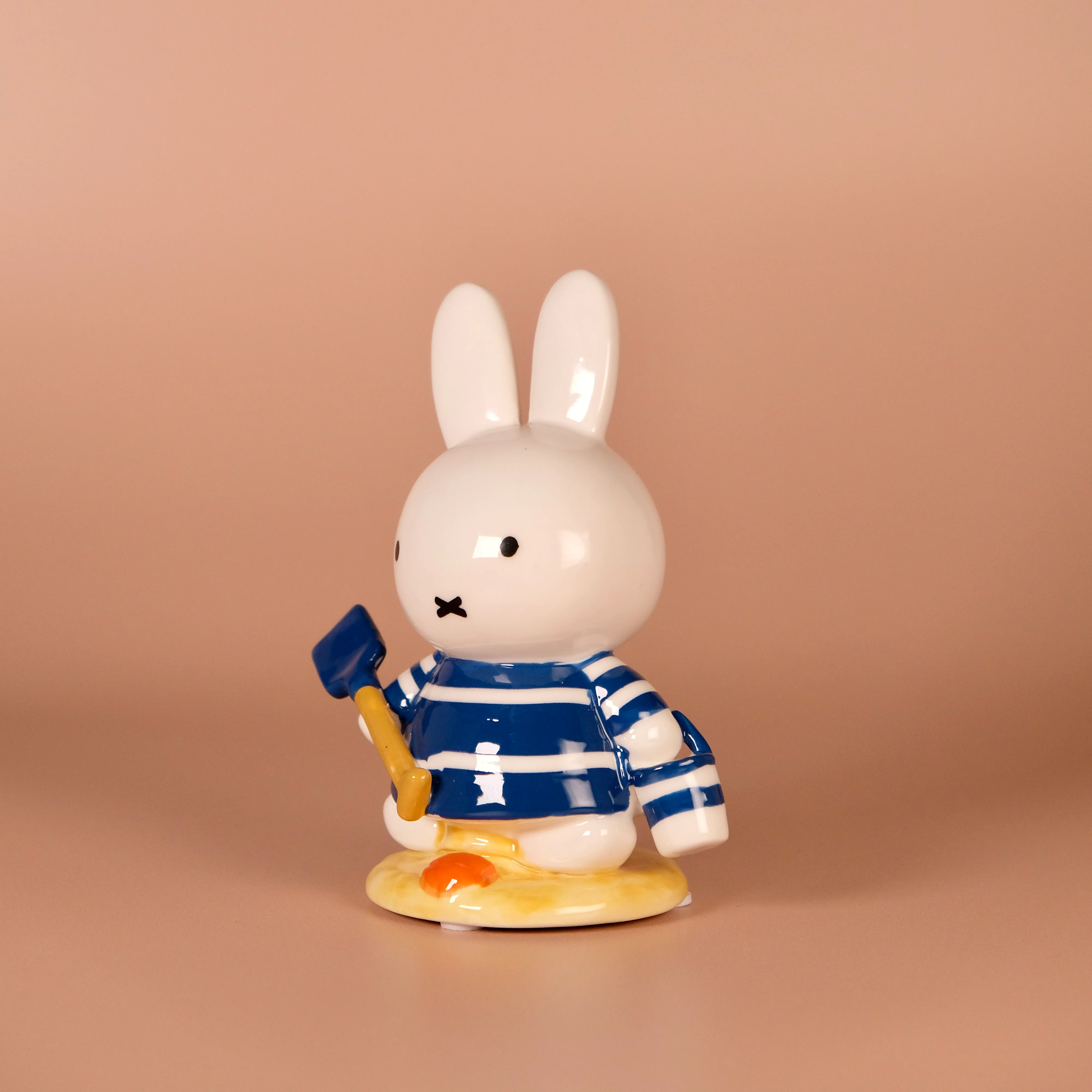 Dressed in her classic blue-and-white striped outfit, Miffy holds a bright beach shovel as she enjoys a day of play in the sand. The glossy, hand-painted finish highlights every cheerful detail—from her simple expression to the tiny orange seashell at her feet. Perfect for fans of Miffy’s timeless world or anyone who loves playful, seaside-inspired décor. 🌊💙
